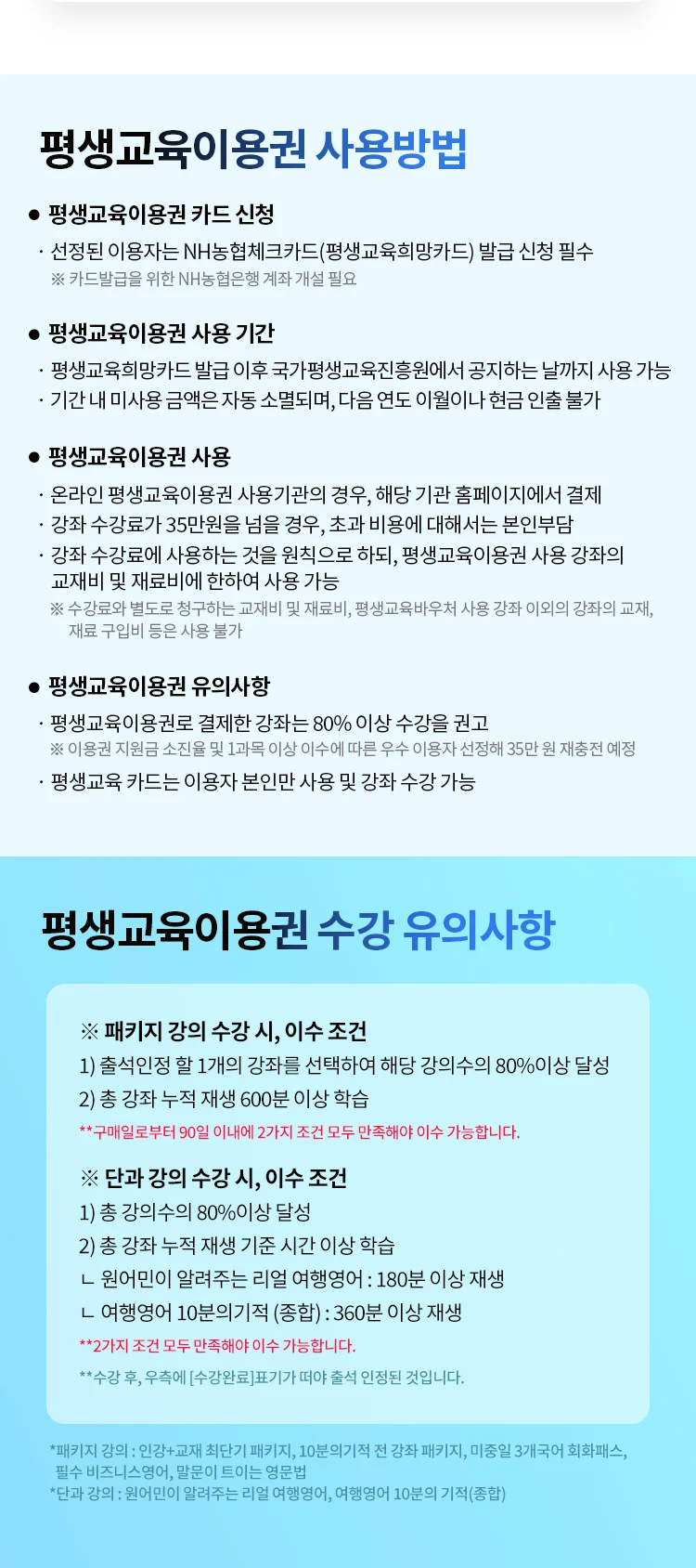 1. 평생교육 이용권 적용 미대상 상품 및 서비스를 바우처 카드로 결제할 경우 일주일 내 승인 취소됩니다.